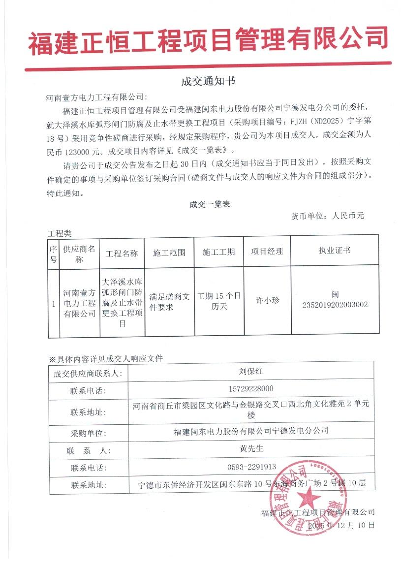 大澤溪電站引水系統(tǒng)閥門大修等項目成交通知書